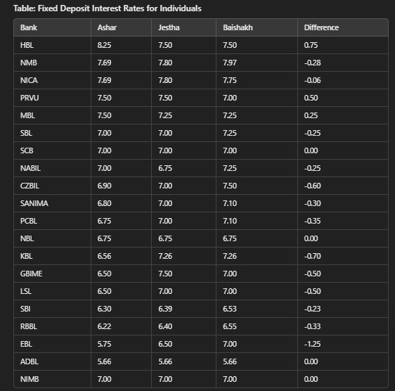 - Banks That Increased Rates: Himalayan Bank (HBL) increased by 0.75% compared to the previous quarter.