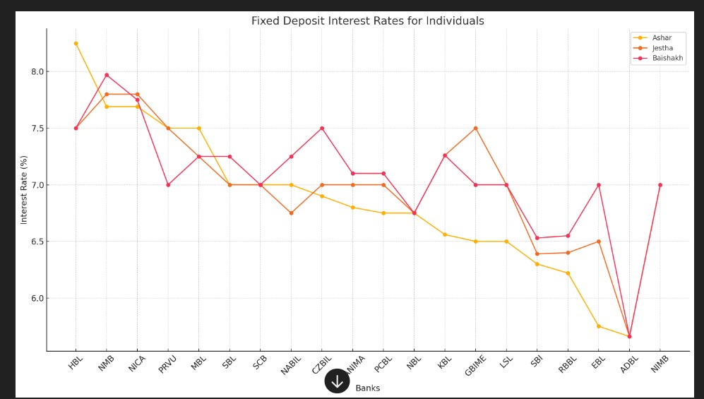 For the month of Ashar, all commercial banks have reduced their interest rates on fixed deposits. On average, the interest rate on fixed deposits for individuals is set at 6.87% for Ashar, which is a decrease from the average rate of 7% in Jestha. This represents a reduction of 0.14 percentage points on average.