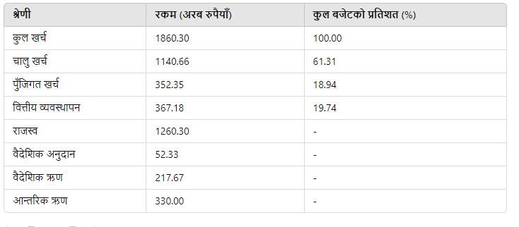 यो खर्च अनुमान चालू वर्षको तुलनामा ६.२ प्रतिशतले बढी हो भने संशोधित अनुमानको तुलनामा २१.५६ प्रतिशत बढी हो। यसले आर्थिक गतिविधि, पूर्वाधार विकास र सार्वजनिक सेवाहरूको सुदृढीकरणमा सरकारको प्रतिबद्धता प्रकट गर्दछ।