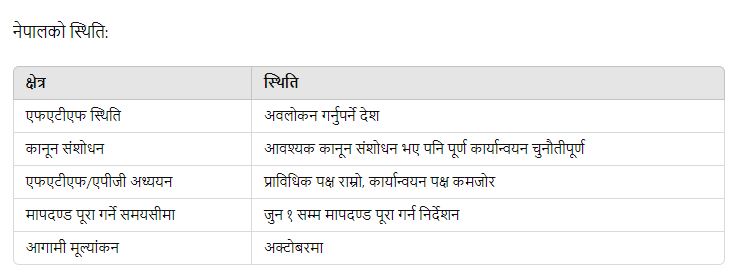 नेपालले आवश्यक कानून संशोधन गरिसकेको भए पनि अझै कयौं मापदण्डहरू पूरा गर्न बाँकी छ। समयमै ती मापदण्डहरू पूरा नगरे निगरानी सूचीमा पर्ने जोखिम रहेको अर्थमन्त्रालयले जनाएको छ। आगामी अक्टोबरमा नेपाललाई अवलोकन गर्नुपर्ने देशको सूचीबाट बाहिर निकाल्न प्रयास भइरहेको छ।