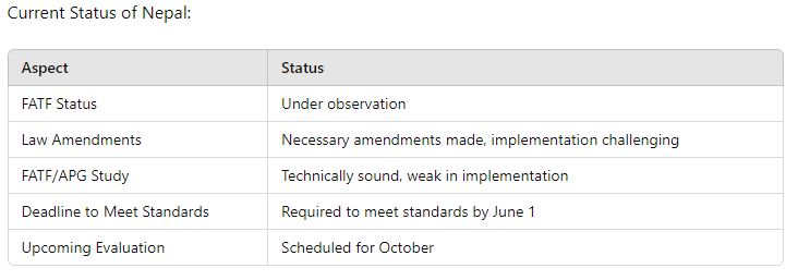Although Nepal has amended the necessary laws, several standards remain unmet. The Ministry of Finance has indicated that failure to meet these standards on time could result in Nepal being placed on a watch list. Efforts are ongoing to remove Nepal from the observation list during the upcoming evaluation in October.