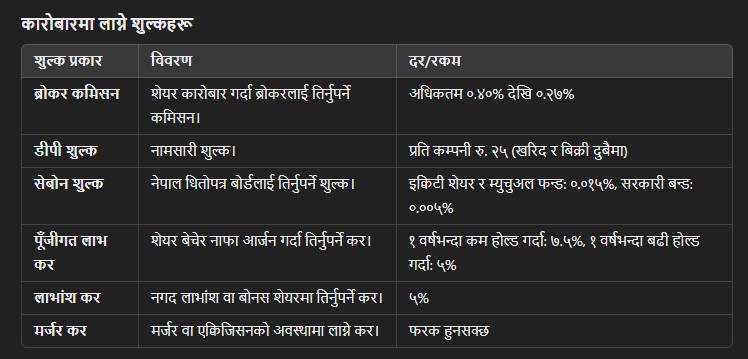 शेयर बजारमा लगानी गर्दा यी शुल्क र करहरूको बारेमा जानकार रहनु अत्यन्त महत्वपूर्ण छ।