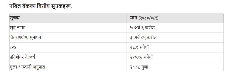 नबिल बैंकले आर्थिक वर्ष २०८०/०८१ मा ७ अर्ब ६ करोड रुपैयाँ खुद नाफा आर्जन गरेको छ, जुन अघिल्लो वर्षको तुलनामा १०.२३ प्रतिशतले बढी हो। बैंकको खुद ब्याज आम्दानीमा ८.६९ प्रतिशतको गिरावट आएको छ, तर इम्पेरमेन्ट चार्ज घटेका कारण नाफा बढ्न पुगेको हो। नबिलको वितरणयोग्य मुनाफा तीन अर्ब ८५ करोड रुपैयाँ रहेको छ, जसले गर्दा बैंकको लाभांश वितरण क्षमता सुधार भएको छ।