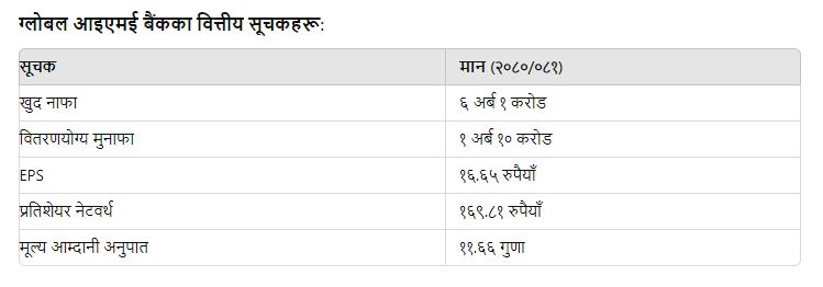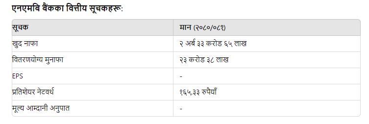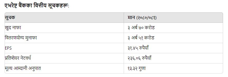 सूचकमान (२०८०/०८१)खुद नाफा३ अर्ब ३ करोडवितरणयोग्य मुनाफा१ अर्ब २८ करोडEPS१३.०९ रुपैयाँप्रतिशेयर नेटवर्थ१७५.८० रुपैयाँमूल्य आम्दानी अनुपात१३.३७ गुणा