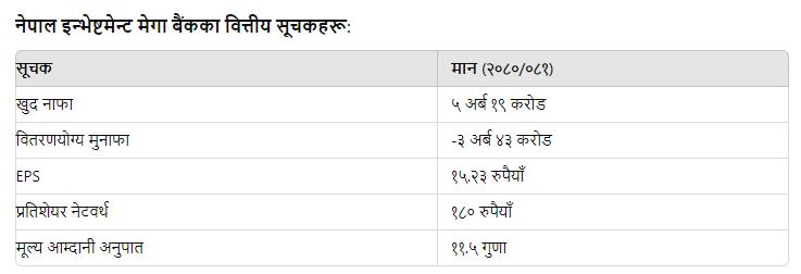 नेपाल इन्भेष्टमेन्ट मेगा बैंकले ५ अर्ब १९ करोड ८३ लाख रुपैयाँ खुद नाफा आर्जन गरेको छ, जुन अघिल्लो वर्षको तुलनामा ३९.७१ प्रतिशत बढी हो। बैंकको खुद ब्याज आम्दानी २२.०२ प्रतिशतले बढेको छ, जसले गर्दा बैंकको नाफा उल्लेख्य रूपमा बढ्न पुगेको हो।