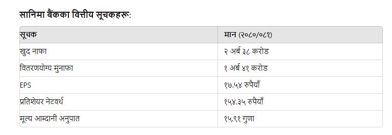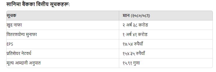 सानिमा बैंकको EPS १७.५४ रुपैयाँ रहेको छ भने नेटवर्थ १५४.३५ रुपैयाँमा सिमित रहेको छ। बैंकको नोक्सानी व्यवस्थामा वृद्धि भएको छ, जसले बैंकको नाफा घटाउन योगदान पुर्याएको छ। बैंकको वितरणयोग्य मुनाफा १ अर्ब ४१ करोड रुपैयाँ रहेको छ, जसले बैंकको लाभांश क्षमतामा केही कमी ल्याएको छ।