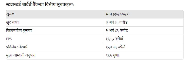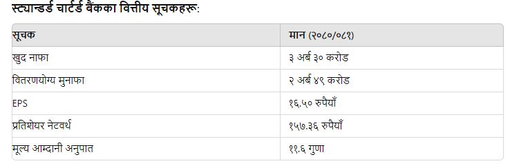 स्ट्यान्डर्ड चार्टर्ड बैंकको वितरणयोग्य मुनाफा २ अर्ब ४९ करोड रुपैयाँ रहेको छ। बैंकको मूल्य आम्दानी अनुपात ११.६ गुणा रहेको छ, जसले बैंकको वित्तीय स्थिरता र लाभांश वितरण क्षमतामा सकारात्मक प्रभाव पारेको छ।