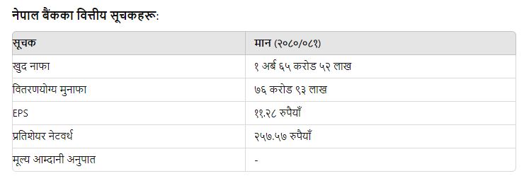 सरकारी स्वामित्वको नेपाल बैंक लिमिटेडले गत आर्थिक वर्षमा १ अर्ब ६५ करोड ५२ लाख रुपैयाँ खुद नाफा आर्जन गरेको छ, जुन अघिल्लो वर्षको तुलनामा ५१.८५ प्रतिशतले कम हो। बैंकको खुद ब्याज आम्दानी ६.४३ प्रतिशतले घटेर ८ अर्ब ८० करोड २१ लाख रुपैयाँमा सीमित भएको छ।