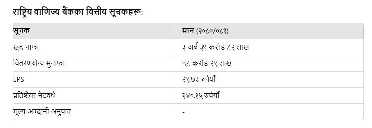 राष्ट्रिय वाणिज्य बैंकले गत आर्थिक वर्षमा ३ अर्ब ३९ करोड ८२ लाख रुपैयाँ खुद नाफा आर्जन गरेको छ, जुन अघिल्लो वर्षको तुलनामा ५.४८ प्रतिशतले कम हो। बैंकको खुद ब्याज आम्दानी १३.३९ प्रतिशतले घटेको छ भने इम्पेयरमेन्ट चार्जमा कमी आएको छ।