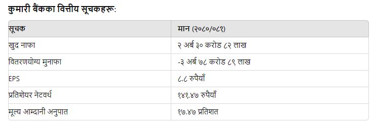 कुमारी बैंकको खुद ब्याज आम्दानी ०.७२ प्रतिशतले घटेर १० अर्ब ९८ करोड ६८ लाख रुपैयाँमा सीमित भएको छ। बैंकको वितरणयोग्य नाफा ३ अर्ब ७८ करोड ८९ लाख रुपैयाँ ऋणात्मक रहेको छ, जसले बैंकको लाभांश वितरण क्षमतामा दबाब पारेको छ।