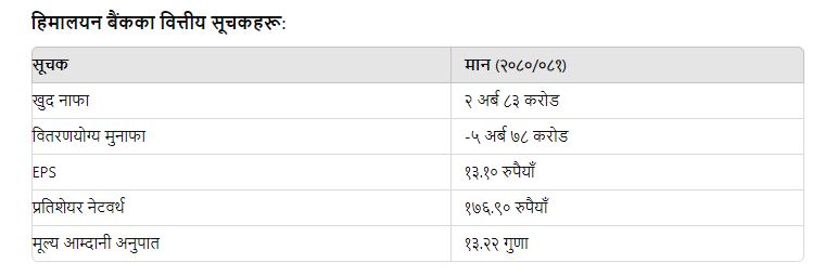 हिमालयन बैंकको खुद सञ्चालन मुनाफा १० अर्ब ३५ करोड रुपैयाँ पुगेको छ। बैंकको EPS १३.१० रुपैयाँमा पुगेको छ, जसले बैंकको वित्तीय प्रदर्शनमा सुधार आएको देखाउँछ। तथापि, बैंकको वितरणयोग्य मुनाफा ५ अर्ब ७८ करोड रुपैयाँ ऋणात्मक रहेको छ।