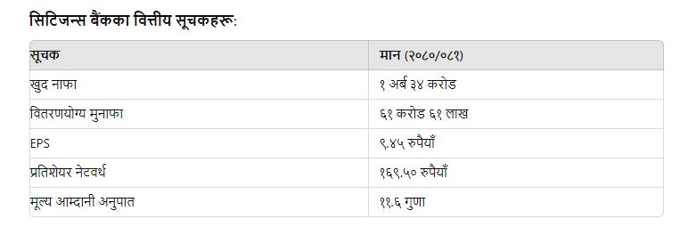 सिटिजन्स बैंकले यो गत आर्थिक वर्षमा १ अर्ब ३४ करोड रुपैयाँ बराबरको नाफा कमाएको छ, जुन अघिल्लो वर्षको तुलनामा २८ प्रतिशतले घटेको हो। बैंकको खुद ब्याज आम्दानी ५ अर्ब ६८ करोड रुपैयाँ रहेको छ, जुन अघिल्लो वर्षको तुलनामा थोरै घटेको हो।
