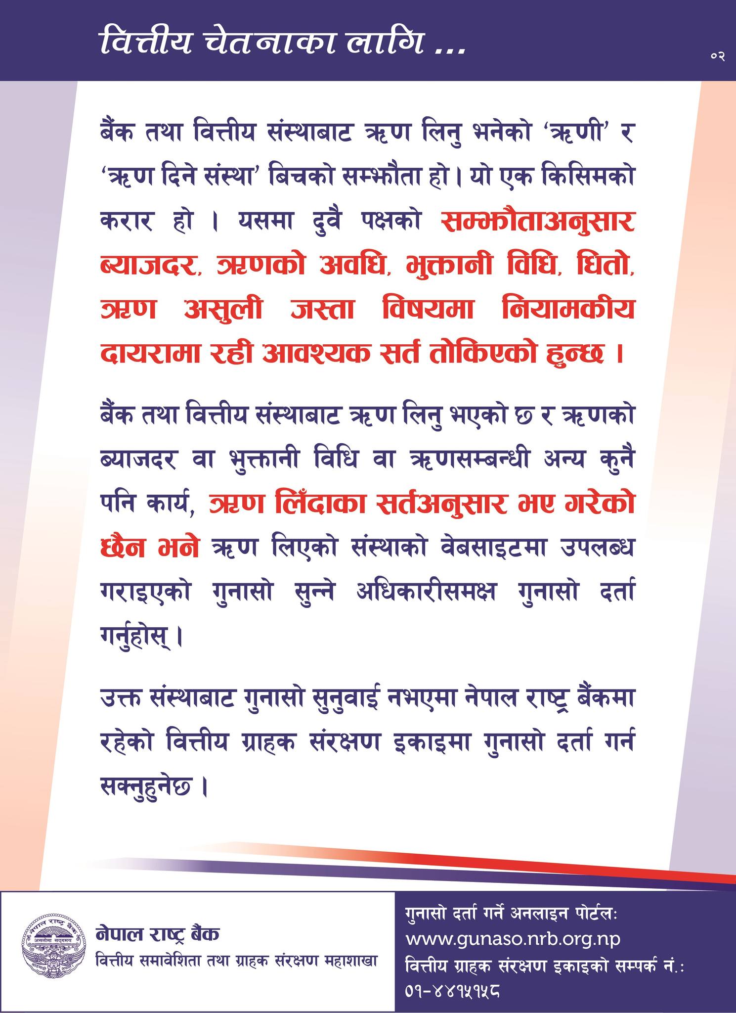 नेपाल राष्ट्र बैंकले बैंक तथा वित्तीय संस्थाबाट ऋण लिँदा ऋणीलाई सर्त पुरा नगरेको अवस्थामा गुनासो दर्ता गर्न आग्रह गरेको छ। राष्ट्र बैंकले गुनासो दर्ता गर्ने अनलाइन पोर्टल समेत बनाएको छ, जसको माध्यमबाट ग्राहकहरूले सहजै आफ्नो समस्या समाधानका लागि सम्बन्धित अधिकारीलाई जानकारी गराउन सक्छन्।