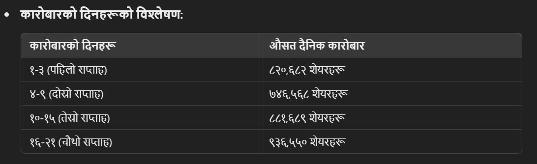 - कारोबारको वृद्धि: जेठमा प्रतिदिन लगभग १ अर्ब रुपैयाँको शेयर कारोबार भएको थियो। जेठमा कुल शेयर कारोबार २१.६७९ मिलियन शेयरहरूमा थियो, जसमा प्रतिदिनको औसत कारोबार १.३३२ मिलियन शेयरहरूमा थियो।
