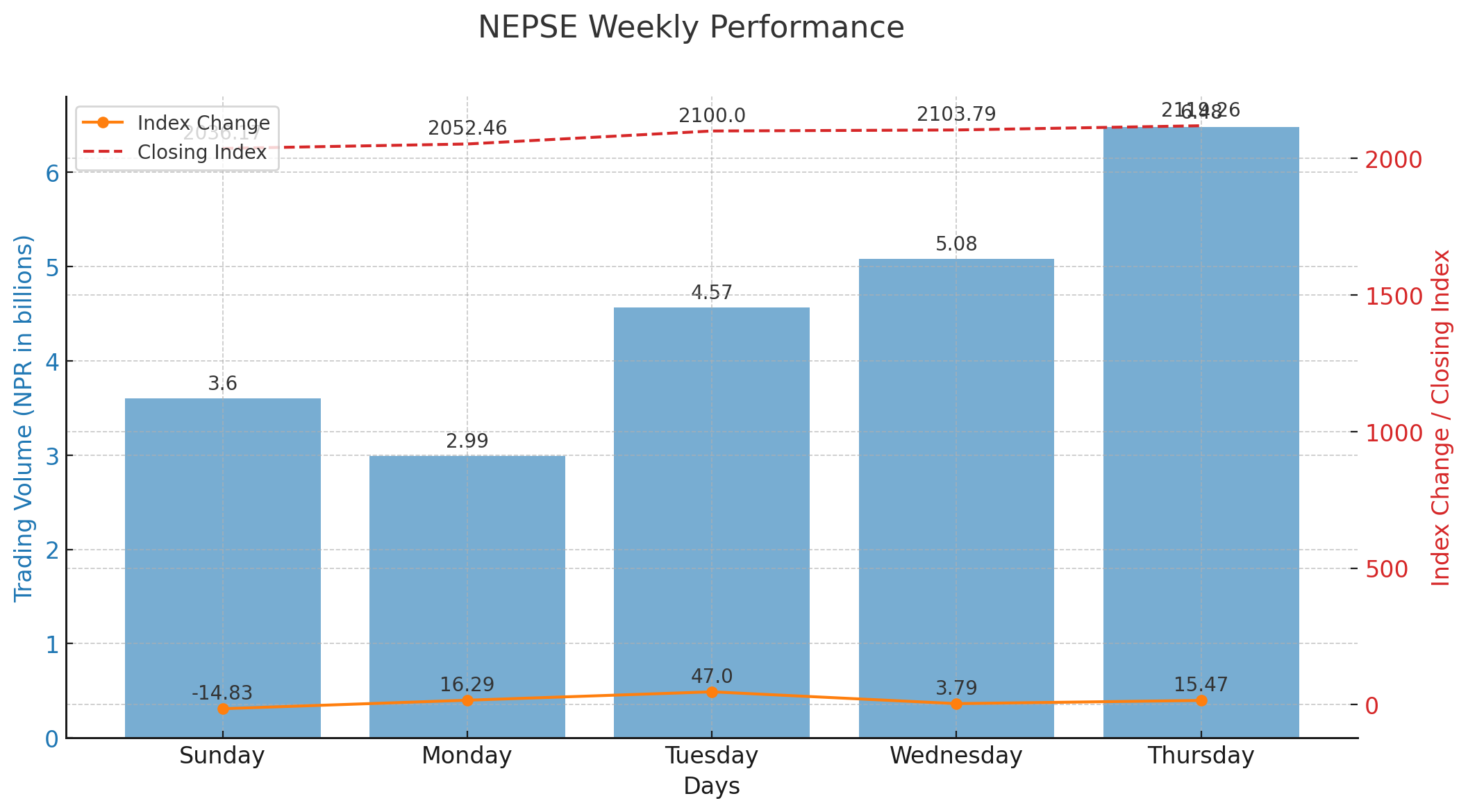 - मंगलबार: दुई पटक सर्किट ब्रेक लाग्यो र बजार २१६२ अंकसम्म पुग्यो। अन्ततः ४७ अंकले बढेर २१०० मा बन्द भयो।