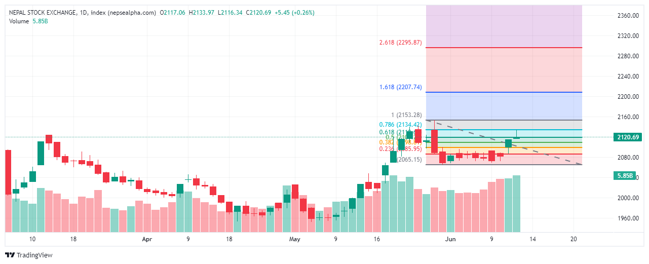 बजारले उतार-चढावपूर्ण गतिविधिहरु देखाएको छ, जसमा उकालो र ओरालो दुवै प्रवृत्ति देखिएको छ। फिबोनाची रिट्रेसमेन्ट स्तरले २,१५३.२८ विन्दुमा प्रतिरोध र २,०६५.१५ विन्दुमा समर्थन देखाउँछ। ०.६१८ रिट्रेसमेन्ट स्तर, जुन बजार गतिविधिको लागि महत्वपूर्ण सूचक हो, २,११४.९८ विन्दुमा रहेको छ, जुन आजको बन्द हुने मूल्य नजिकै छ।
