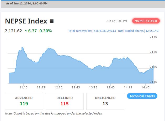 काठमाडौं, जेठ ३० - नेप्से सूचक आज ५.४५ अंकले वृद्धि भई २,१२०.६९ विन्दुमा बन्द भएको छ, जसले ०.२६% को वृद्धि दर्शाउँछ। बजार २,११७.०६ विन्दुमा खुलेको थियो र २,१३३.९७ विन्दुमा उच्चतम विन्दुमा पुगेको थियो, जसपछि २,११६.३४ विन्दुमा न्यूनतम विन्दुमा झरेको थियो। कुल कारोबार रकम ५.८५ अर्ब रुपैयाँ रहेको छ।
